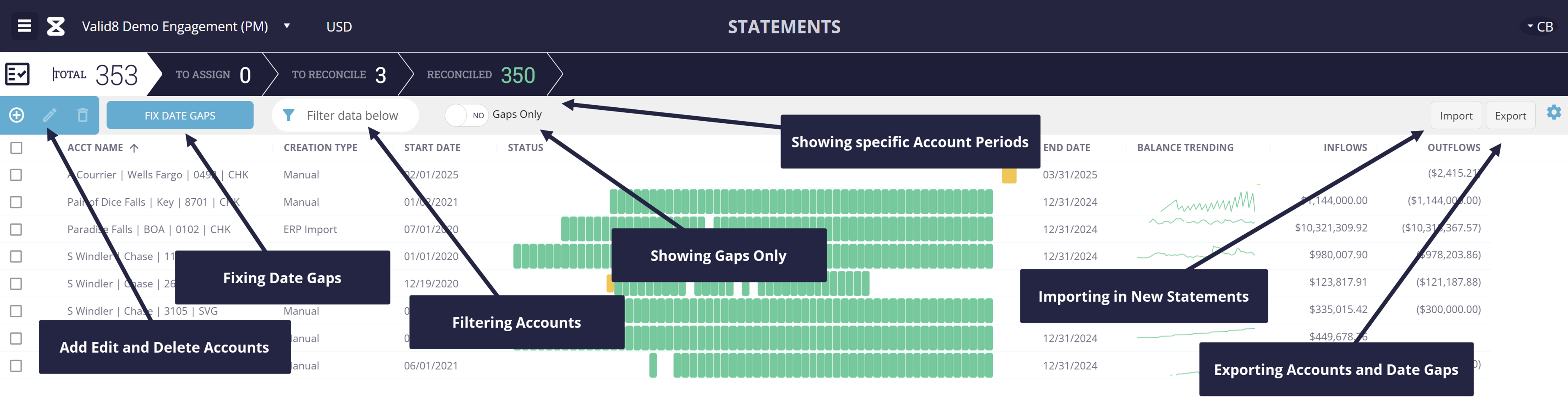 Screen Overview: Listing of all Accounts, with a graphic representation of the statements assigned to each account.